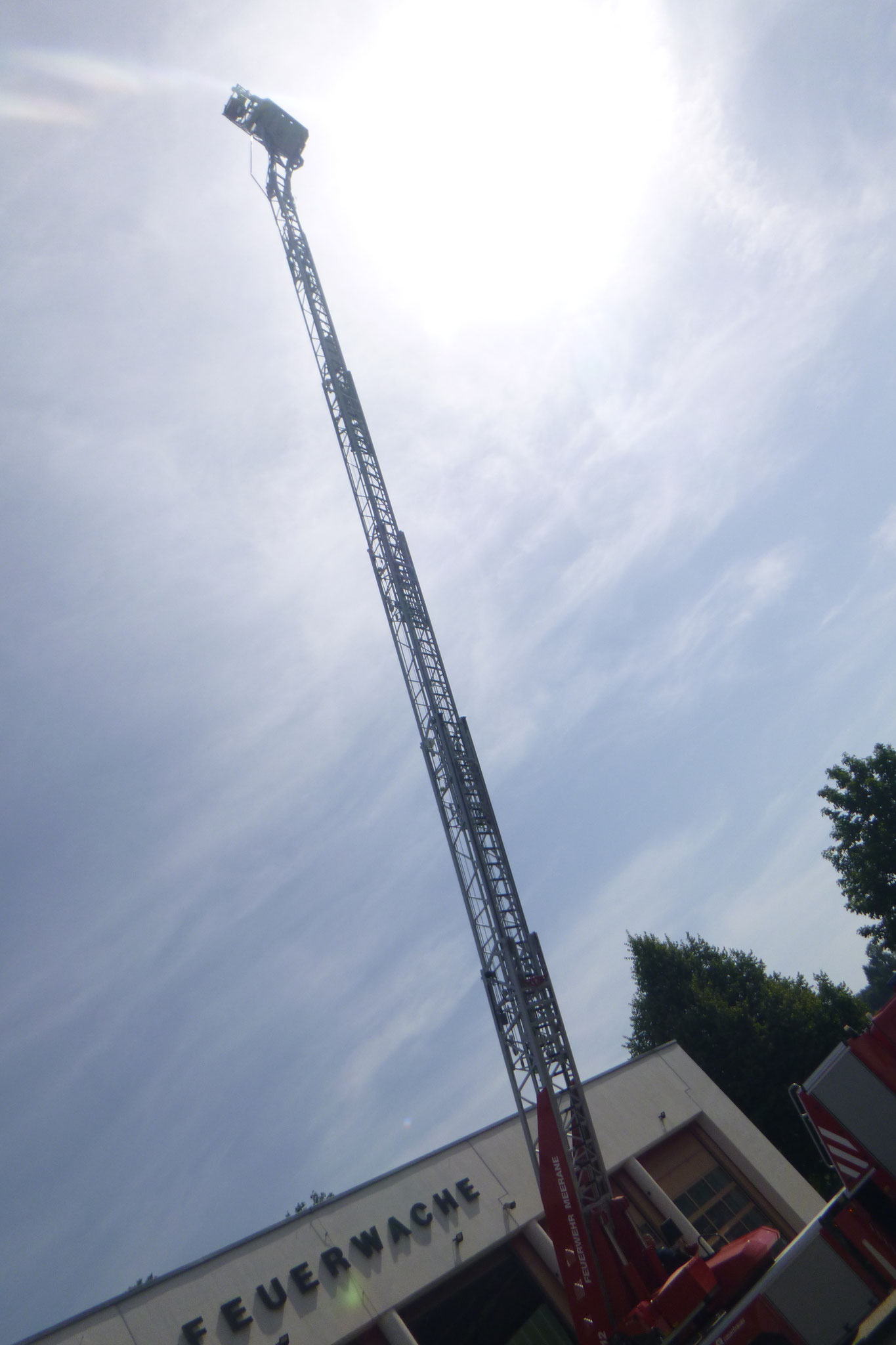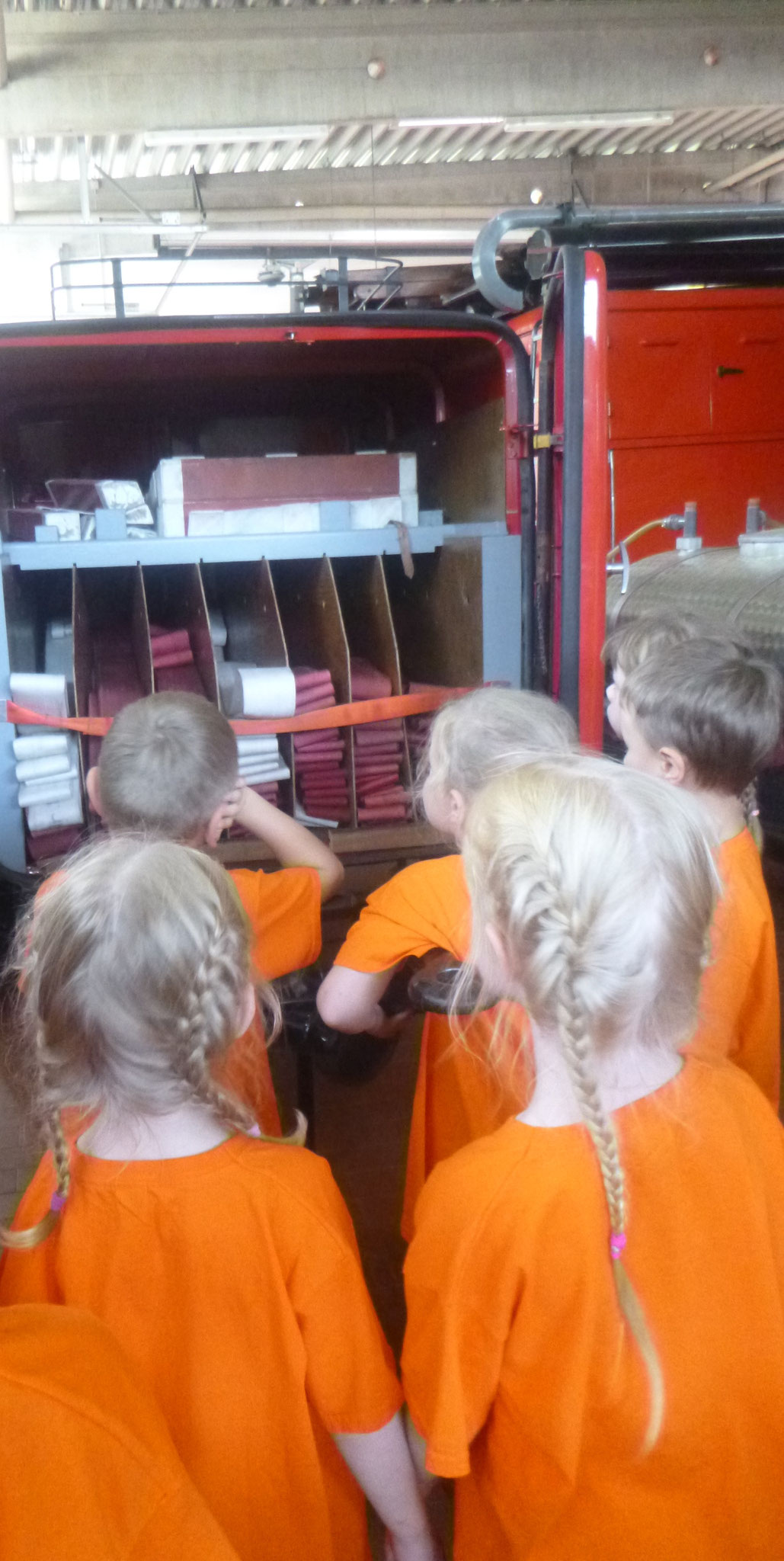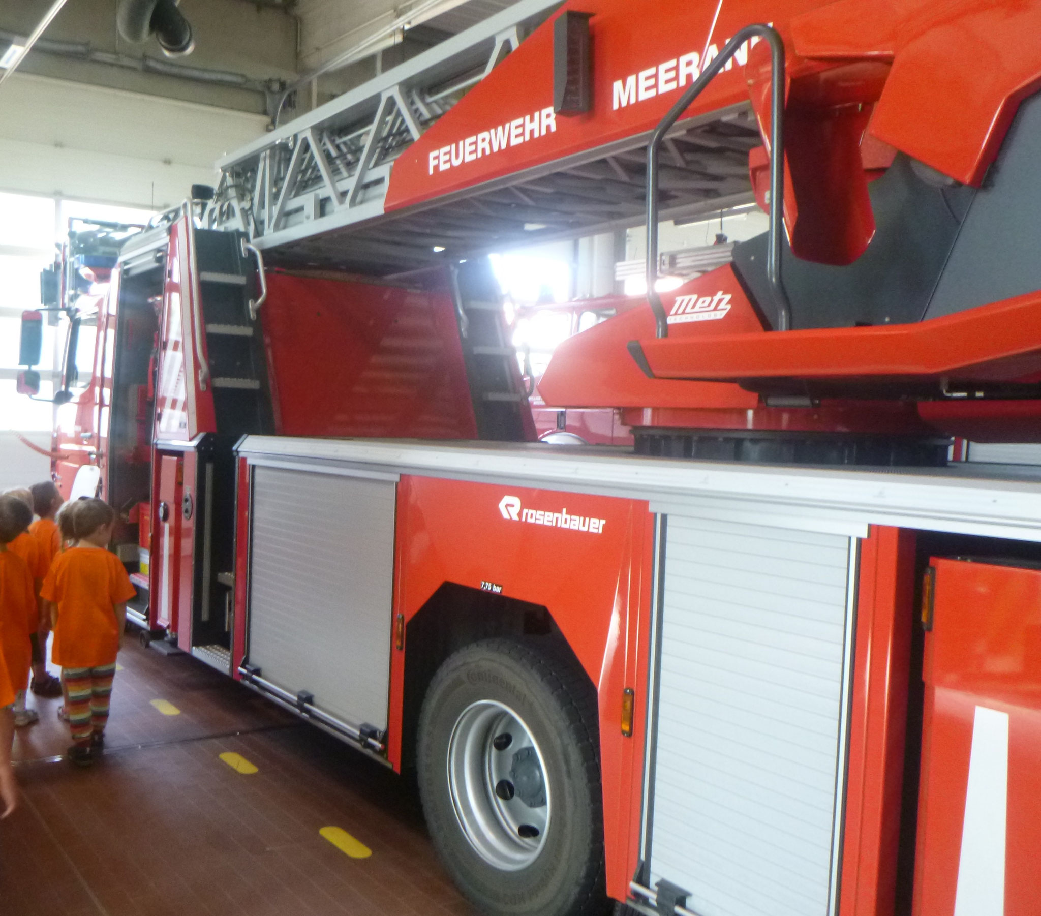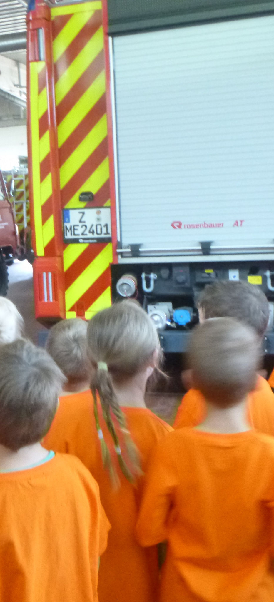 Der Höhepunkt dieser Projektwoche war der Besuch bei der Feuerwehr Meerane. Dank zahlreicher Unterstützung durch unsere Familien, schafften alle trotz des heißen Wetters den Hin- und Rückweg gut. In der Feuerwehr durften unsere Schulanfänger alles anschauen - Fahrzeuge, Umkleideräume, Schlauchlager, -turm und Schlauchreinigungsanlage, sowie Büros, Fahrzeuge und am Ende sogar die sehr hohe Drehleiter. Ganz mutig durften alle in den Korb klettern, allerdings nur am Boden. Ein Feuerwehrmann zeigte uns seine Kleidung und alles, was er braucht, um in ein brennendes Haus zu gehen. All unsere Fragen wurden beantwortet und die Schulanfänger übten das absetzen eines Notrufs. Ganz wichtig dabei die Nummer: 112 und das Kennen der eigenen Adresse. Denn die erste Frage lautet immer: WO ist der Notfall passiert?