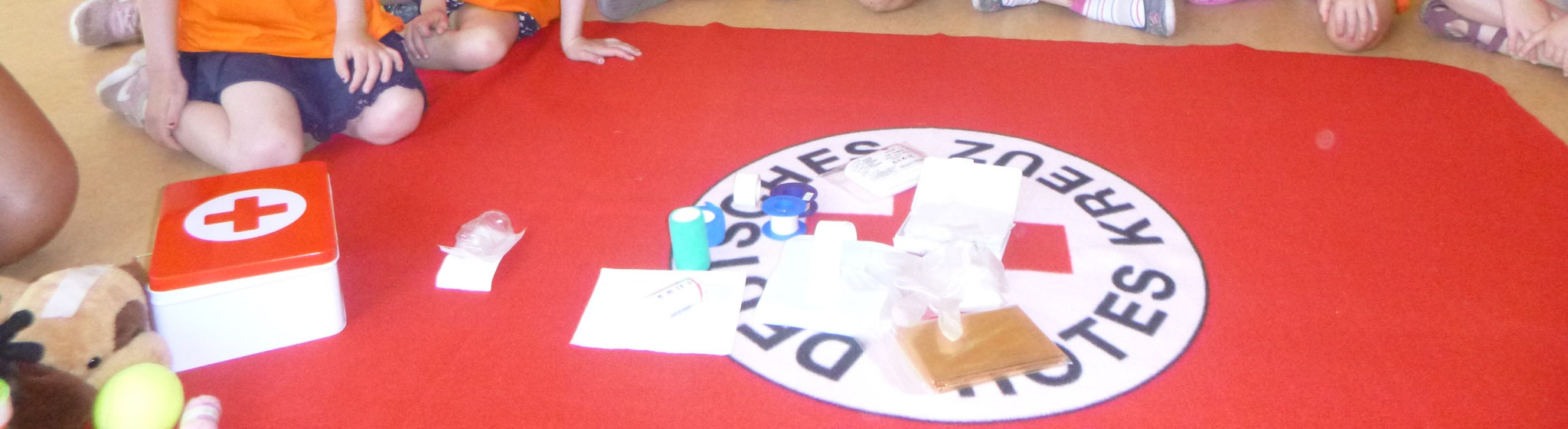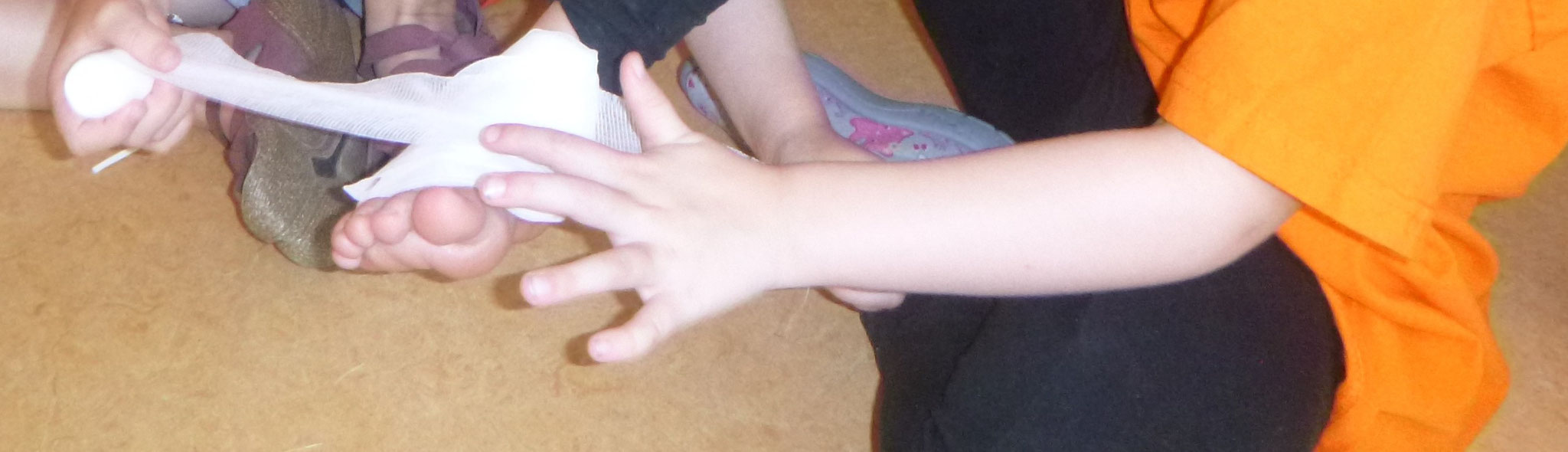 Am zweiten Tag war Erste Hilfe dran: Was ist zu tun bei einem Unfall? Wie kann ich mich gut um Andere kümmern? Wie und wo kann ich Hilfe holen? usw. Es fand zu diesen und weiteren Fragen ein reger Austausch statt. Ein besonderes Augenmerk lag auch hier ebenfalls auf Regeln, die es zu beachten gilt, um Unfälle größtenteils zu verhindern. Während des praktischen Teils übten unsere Schulanfänger in kleinen Teams die Versorgung von Wunden mit Pflastern und Verbänden. Dieses Ausprobieren bereitete viel Freude.